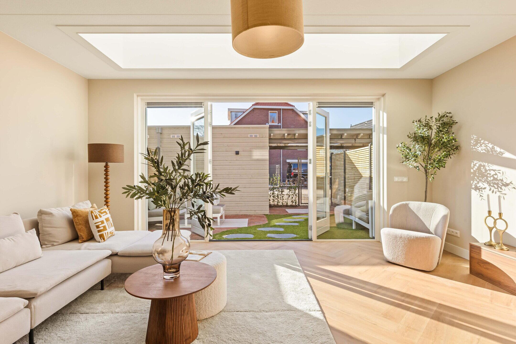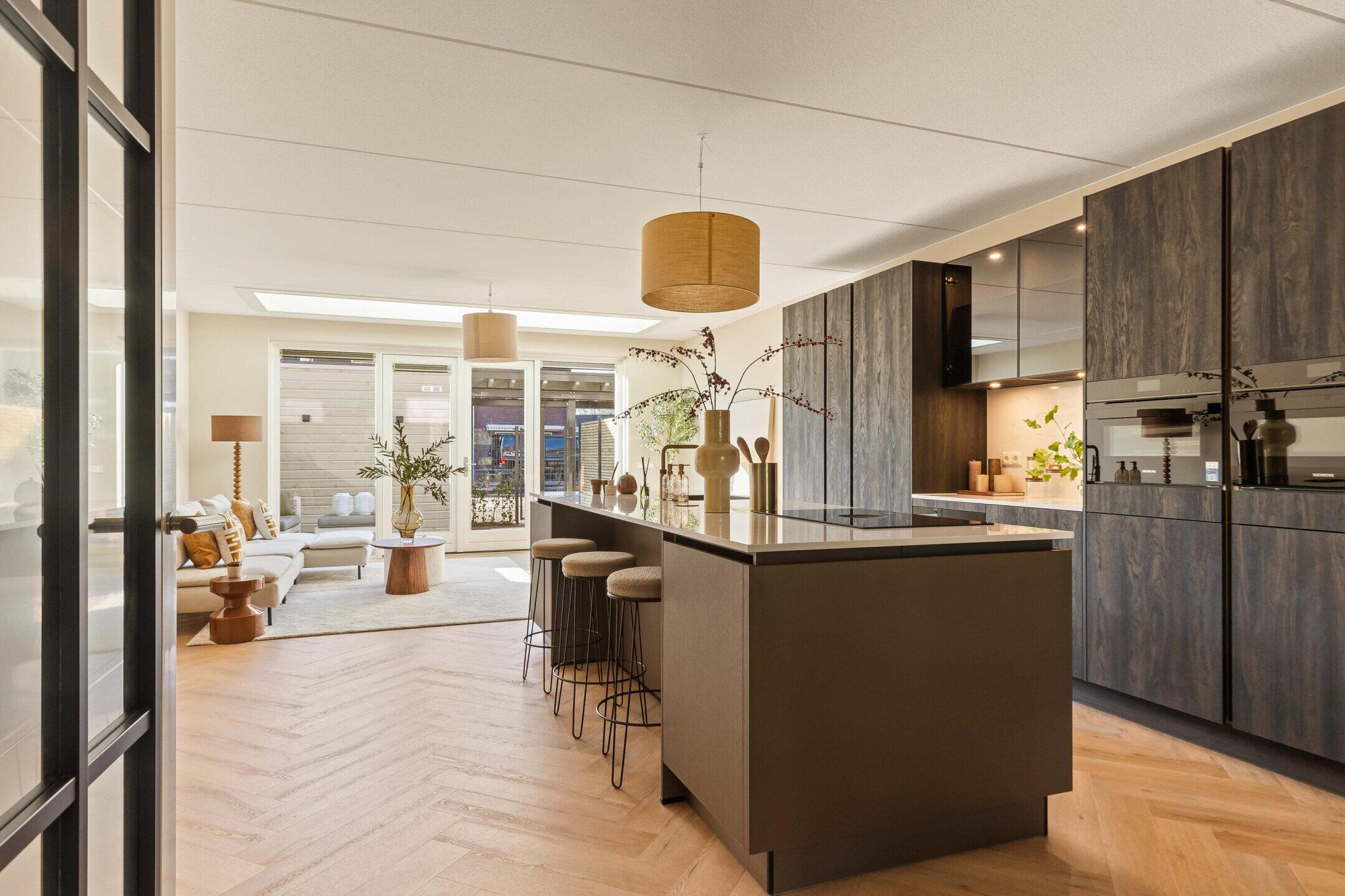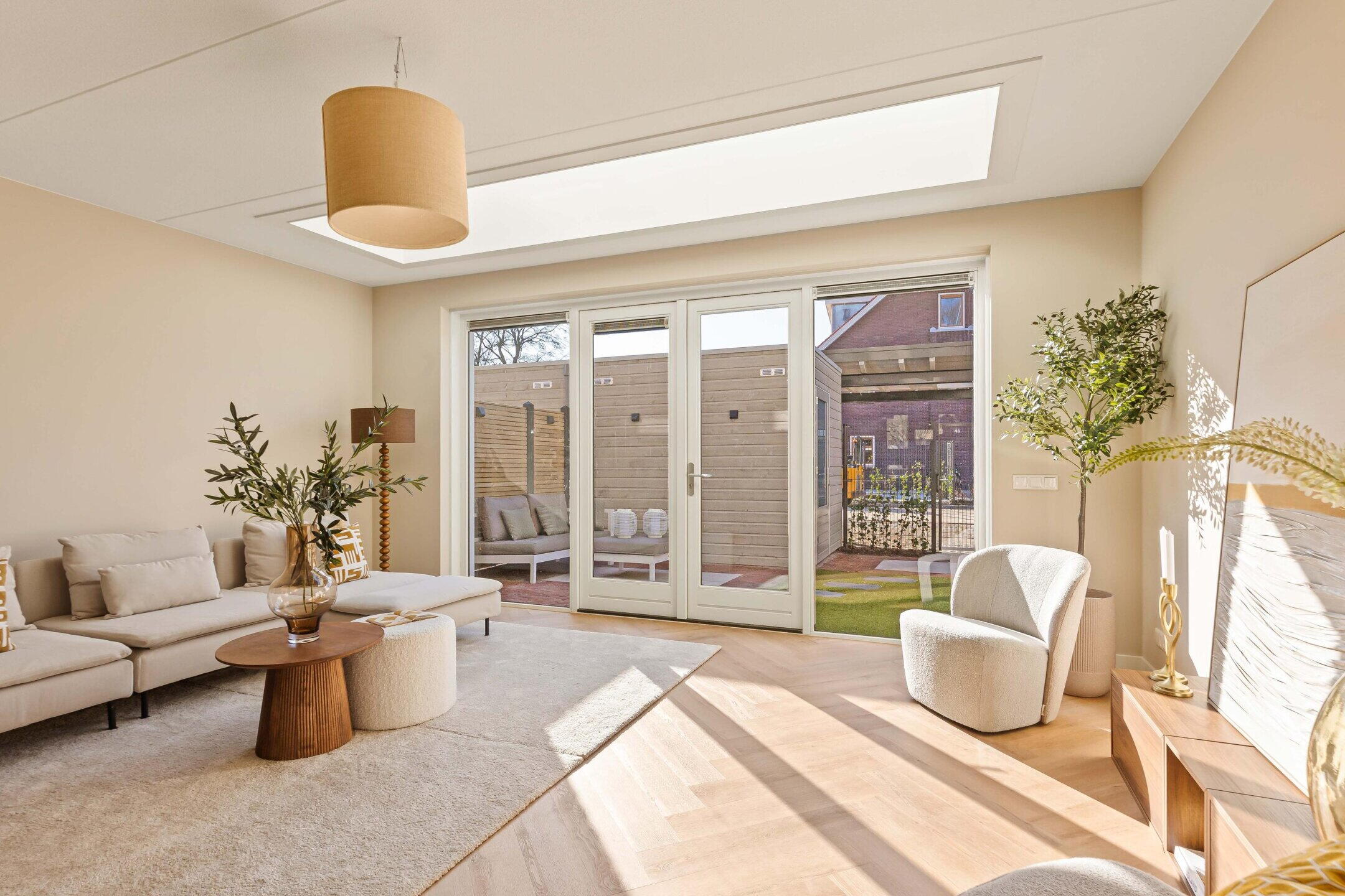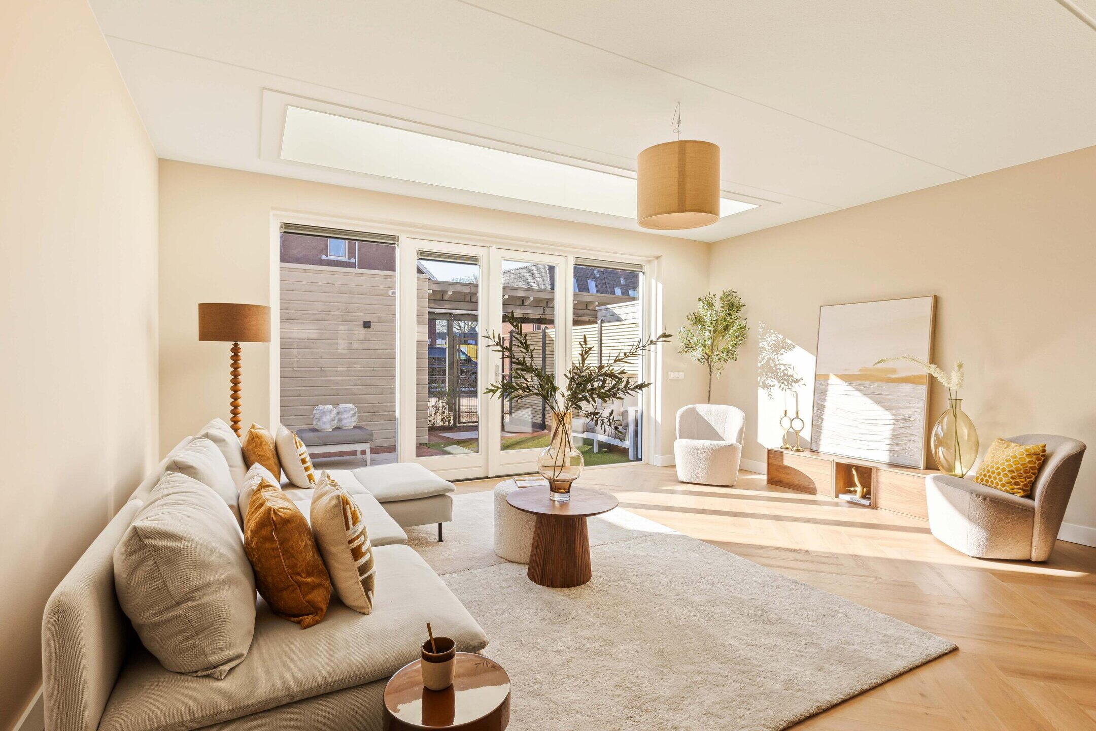 De royale woonkamer bevindt zich aan de achterzijde en is dankzij de grote raampartijen en openslaande deuren heerlijk licht. De hoogwaardige afwerking, warme PVC visgraatvloer en de geïntegreerde lichtstraat zorgen voor een moderne en warme uitstraling waarbij binnen en buiten mooi in elkaar overlopen. De lichtstraat is voorzien van elektrische zonwering met afstandsbediening.