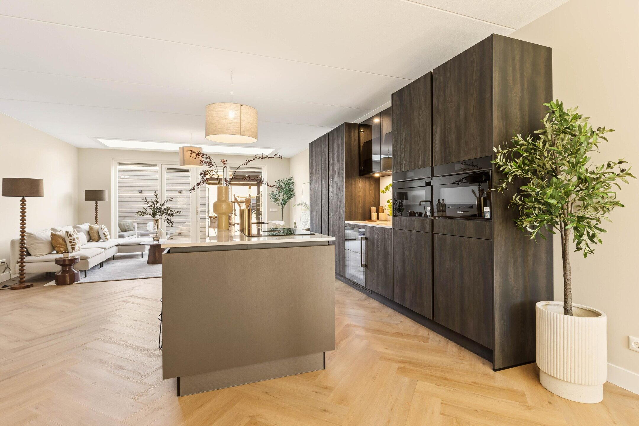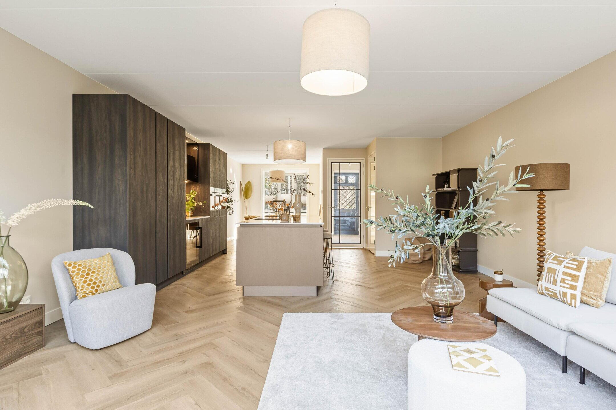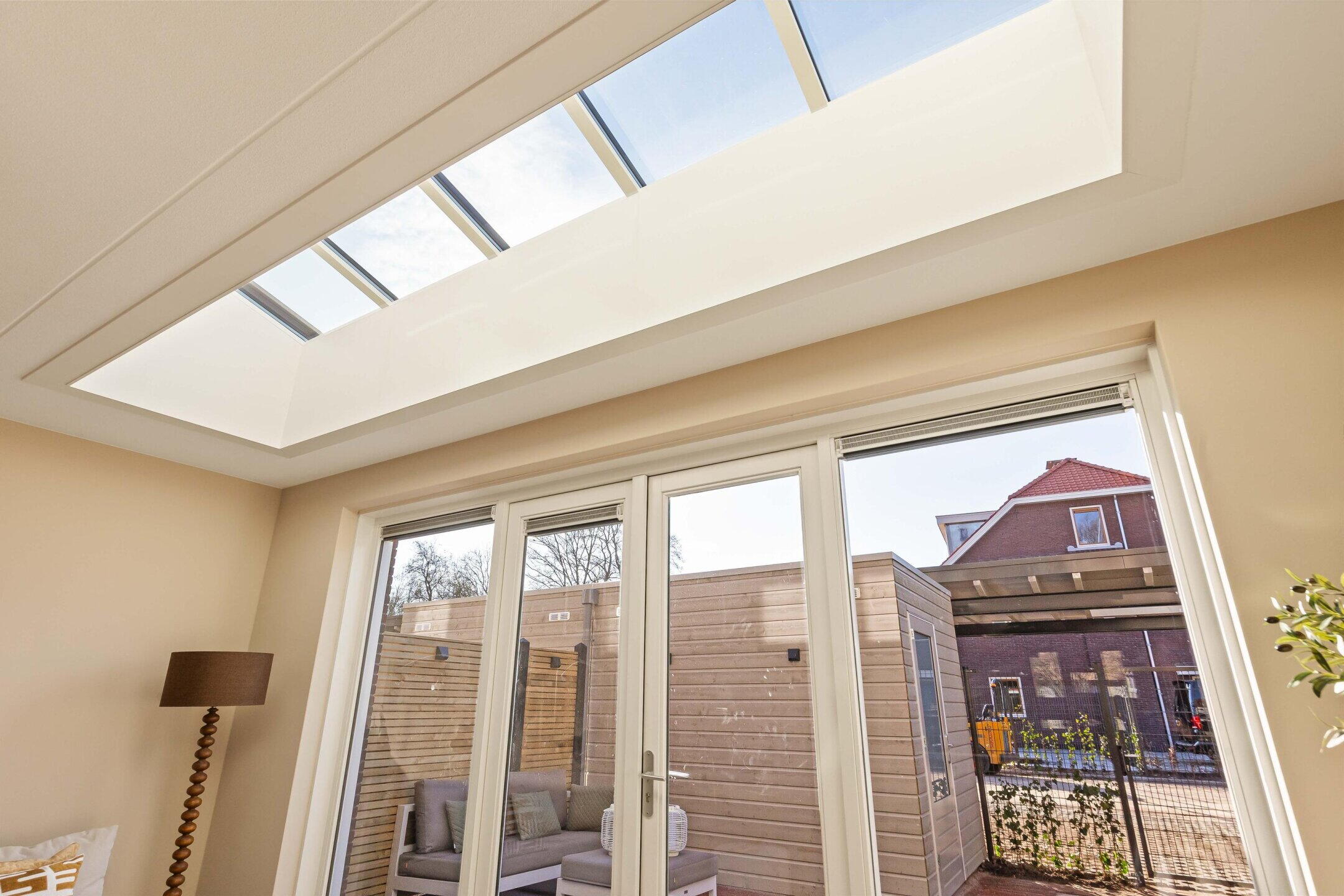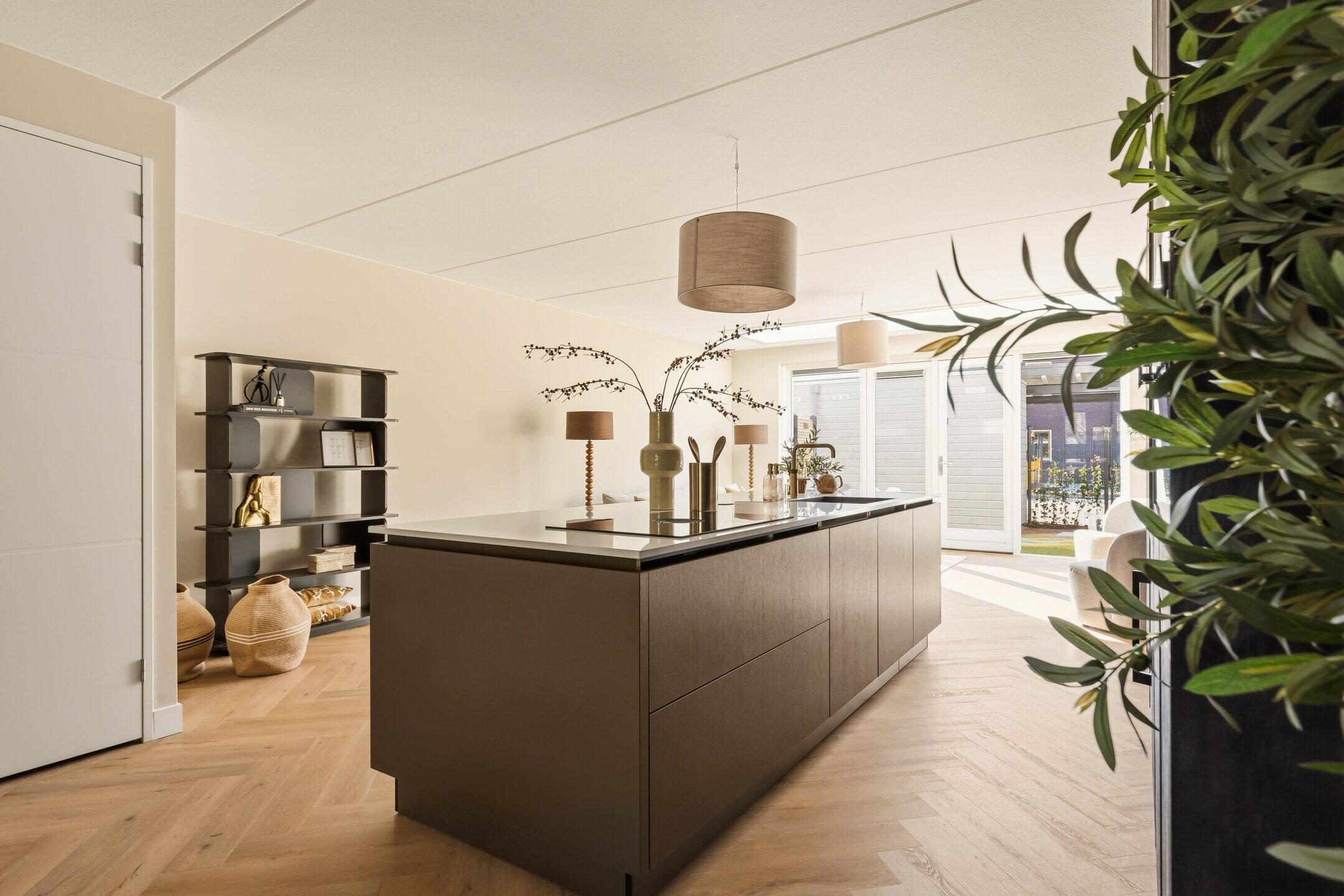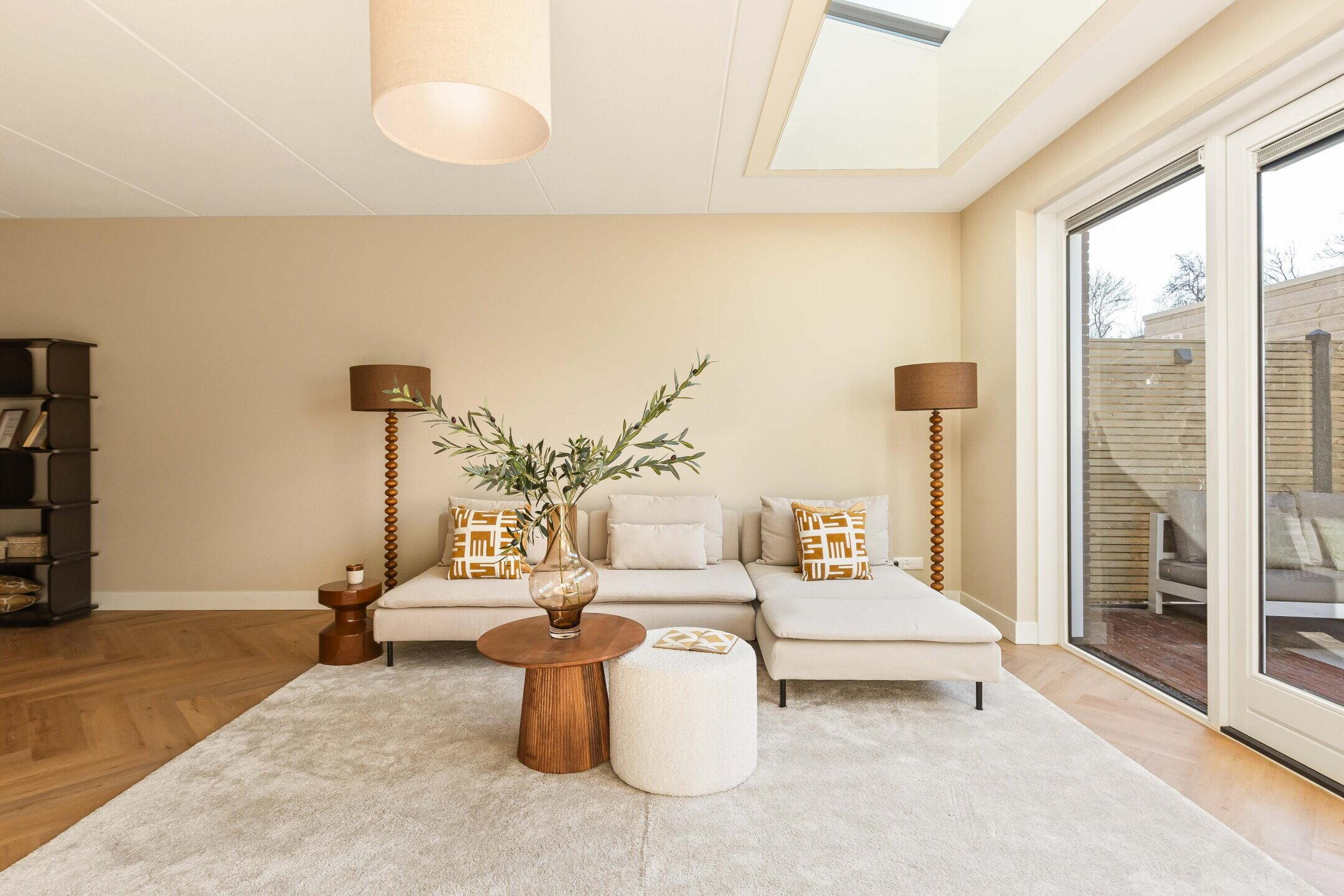 De royale woonkamer bevindt zich aan de achterzijde en is dankzij de grote raampartijen en openslaande deuren heerlijk licht. De hoogwaardige afwerking, warme PVC visgraatvloer en de geïntegreerde lichtstraat zorgen voor een moderne en warme uitstraling waarbij binnen en buiten mooi in elkaar overlopen. De lichtstraat is voorzien van elektrische zonwering met afstandsbediening.