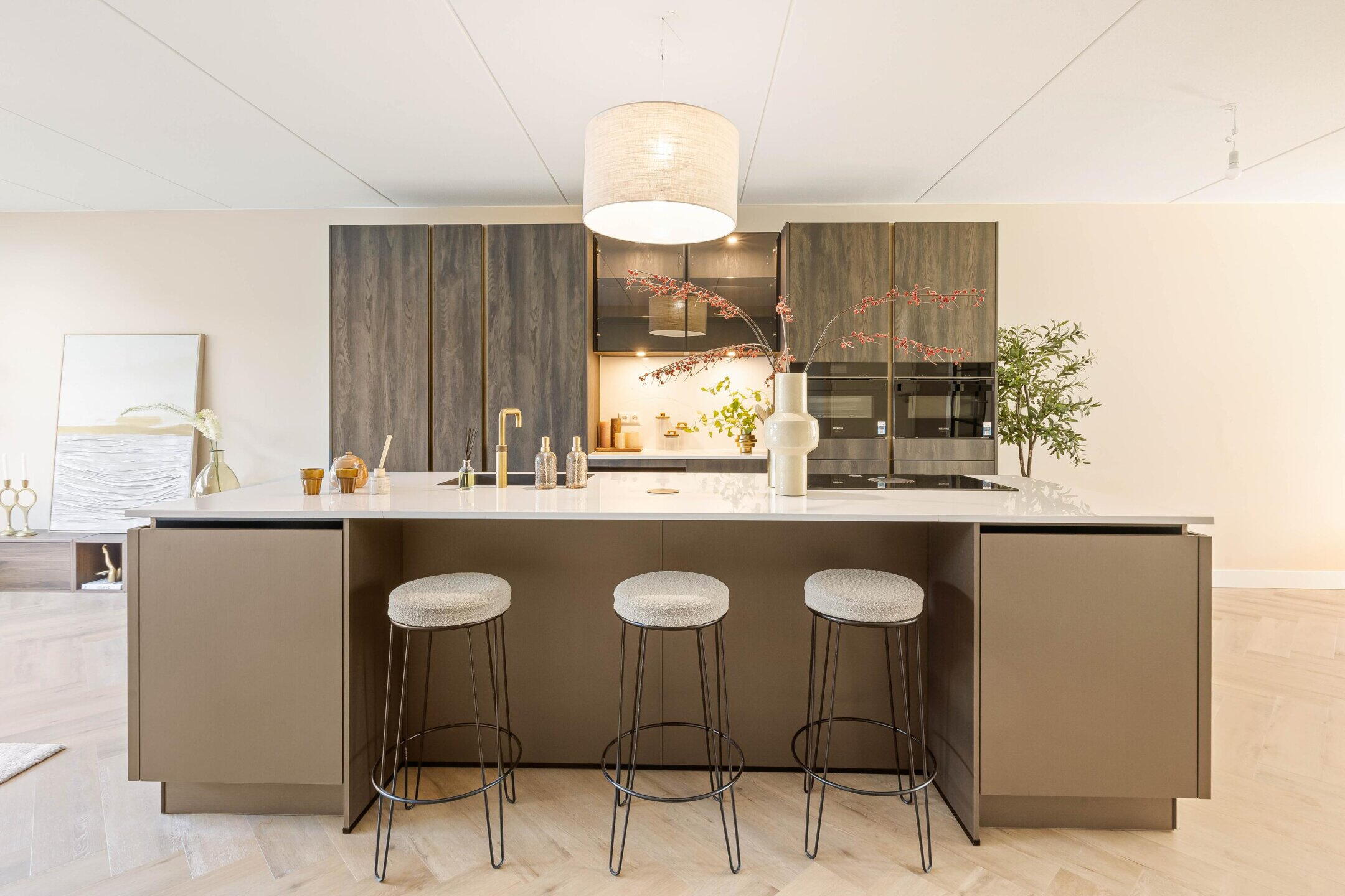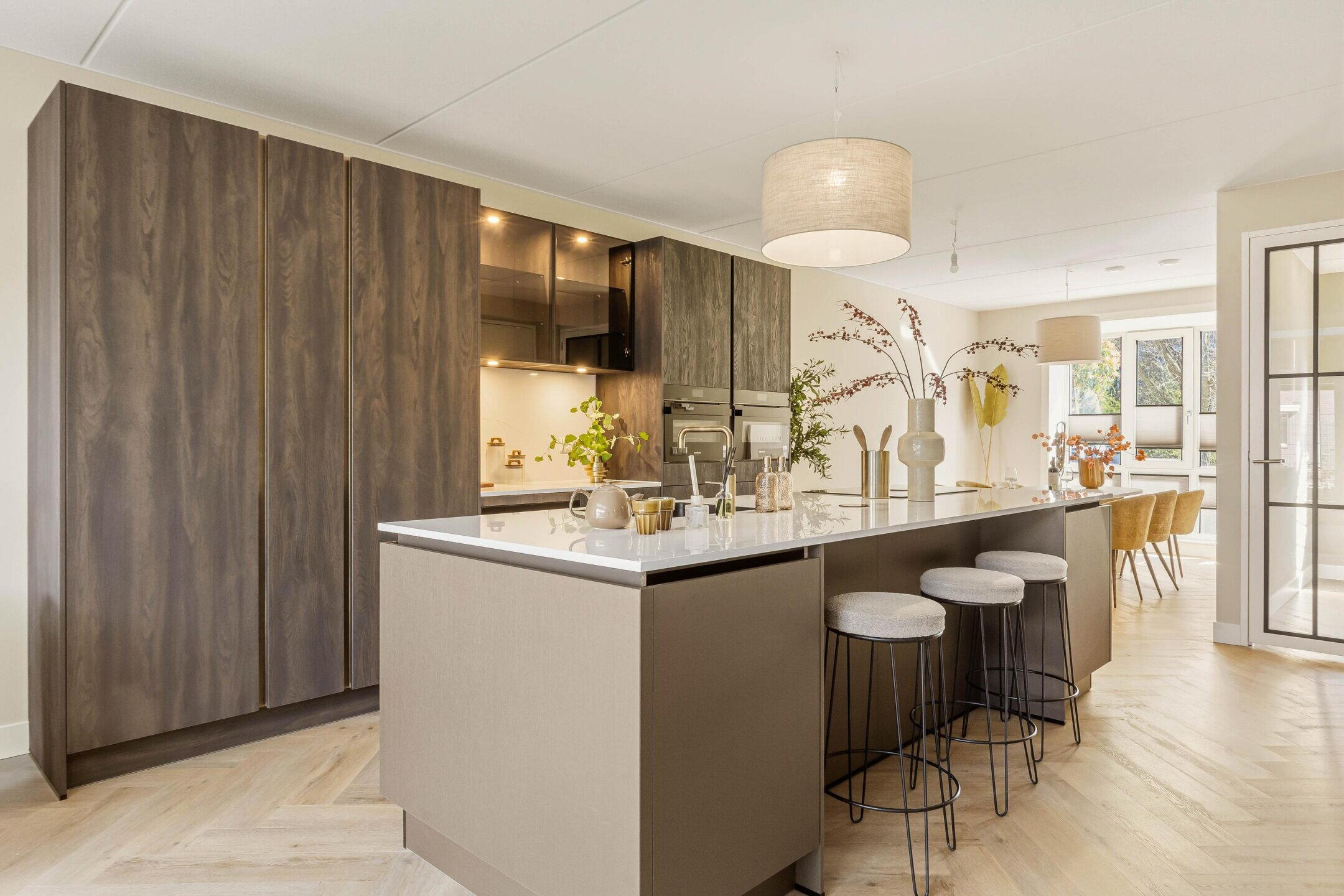 The entrance leads into the foyer with a coat closet and separate restroom. From here, you enter the spacious living area on the ground floor. What immediately stands out is the luxurious open-concept kitchen with a cooking and sink island, finished in a stylish design and equipped with high-quality built-in appliances (including a Quooker, dishwasher, oven, and integrated exhaust system). The cooking island forms the heart of the space and offers not only plenty of workspace but also a cozy place to sit.