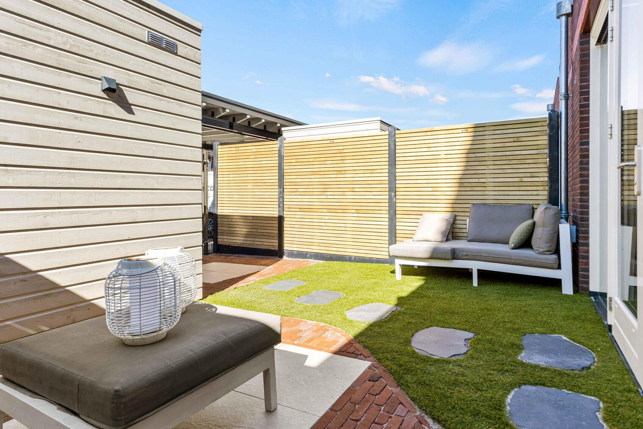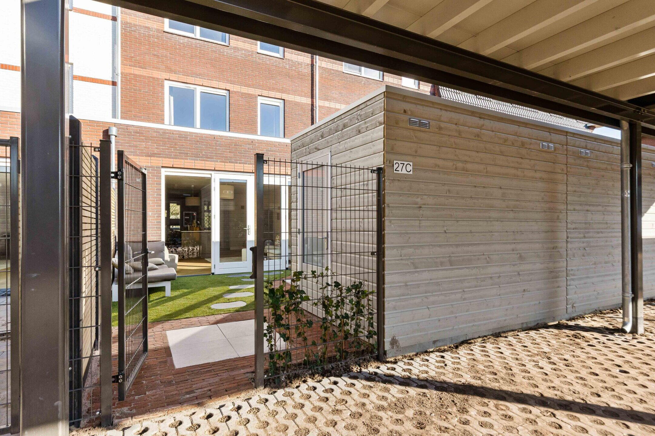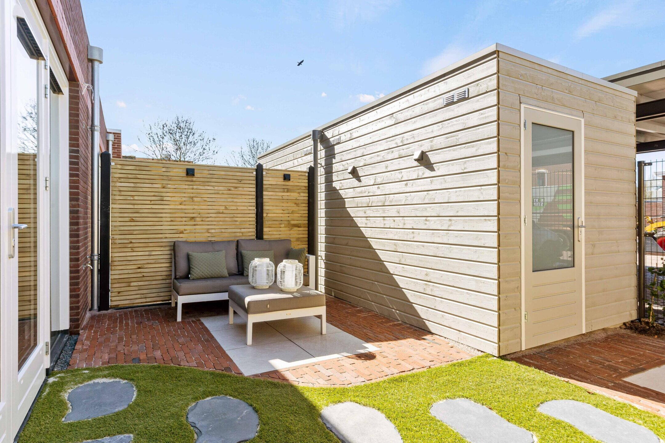De zonnige achtertuin op het Westen is verzorgd aangelegd en biedt een fijne plek om buiten te zitten. Daarnaast bevindt zich in de achtertuin nog een berging en twee privé parkeerplaatsen (eigen terrein).