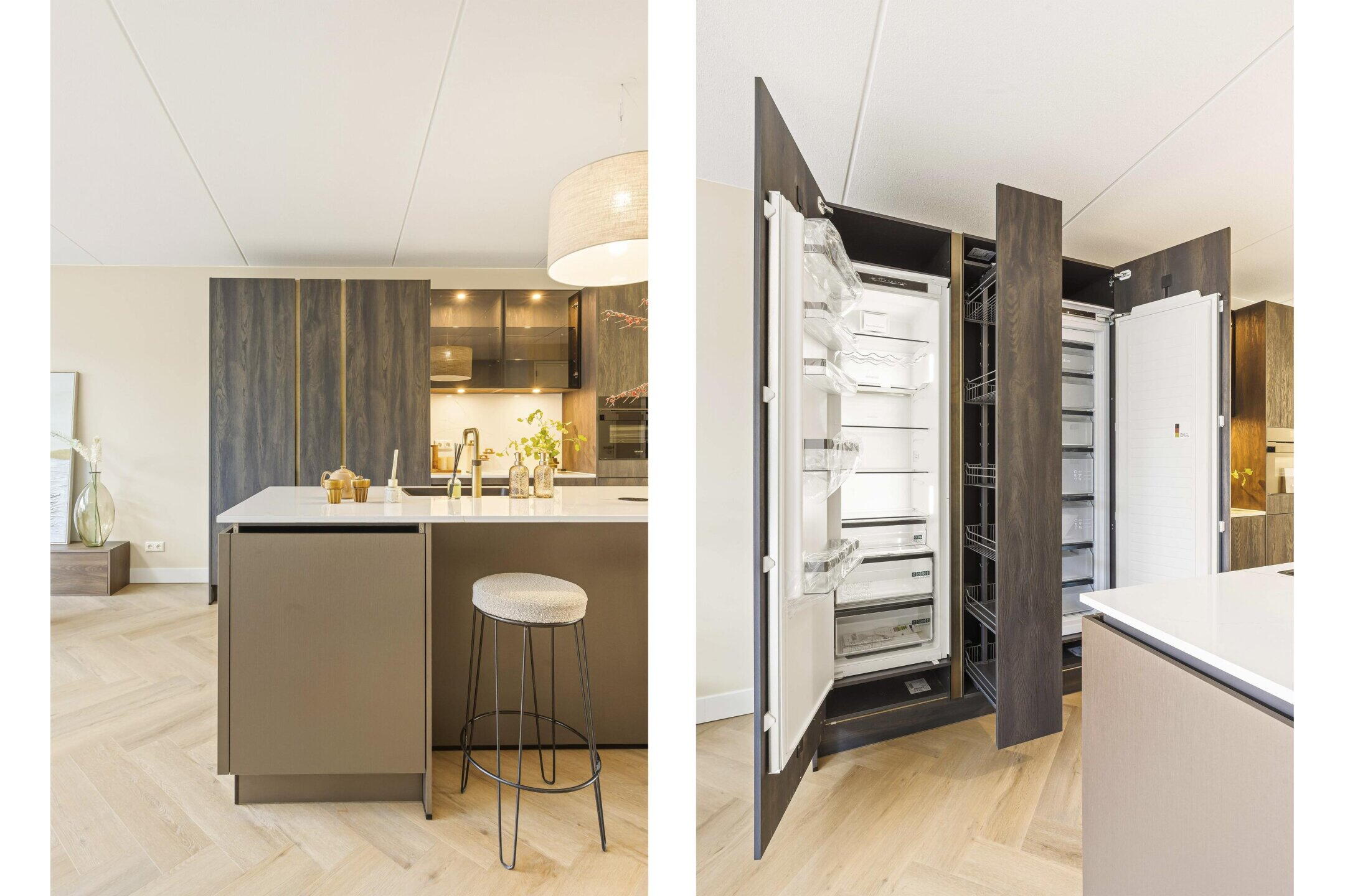 Via de entree komt u in de hal met garderobe en separaat toilet. Vanuit hier betreedt u de royale leefruimte op de begane grond. Wat direct opvalt is de luxe open woonkeuken met kook- en spoeleiland, uitgevoerd in een stijlvolle afwerking en voorzien van hoogwaardige inbouwapparatuur (w.o. Quooker, vaatwasser, oven en geïntegreerd afzuigsysteem). Het kookeiland vormt het hart van de ruimte en biedt niet alleen veel werkruimte, maar ook een gezellige plek om aan te zitten.