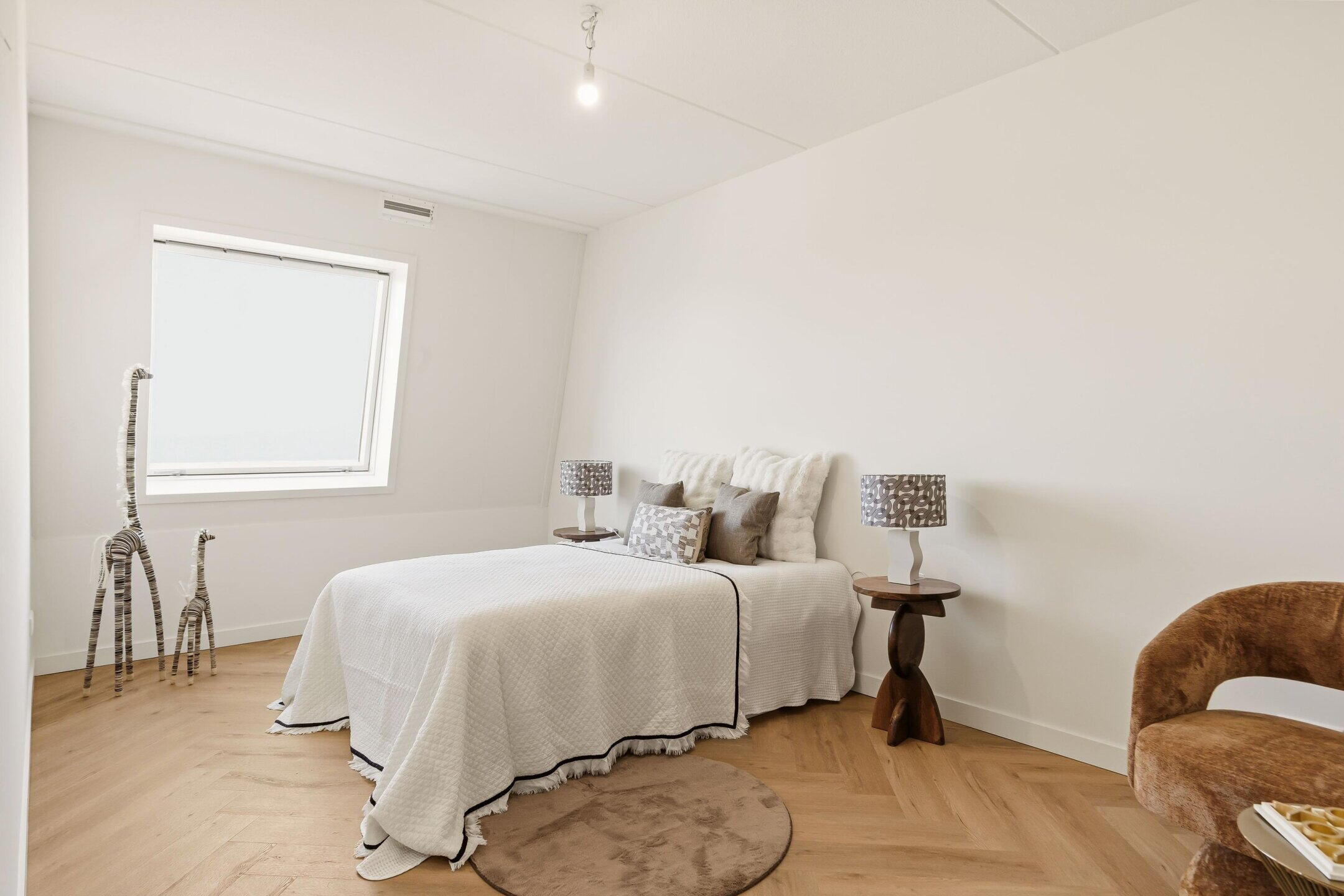 The spacious living room is located at the rear and is wonderfully bright thanks to the large windows and French doors. The high-quality finishes, warm PVC herringbone flooring, and the integrated skylight create a modern and warm atmosphere where the indoors and outdoors blend seamlessly. The skylight is equipped with electric blinds with a remote control.